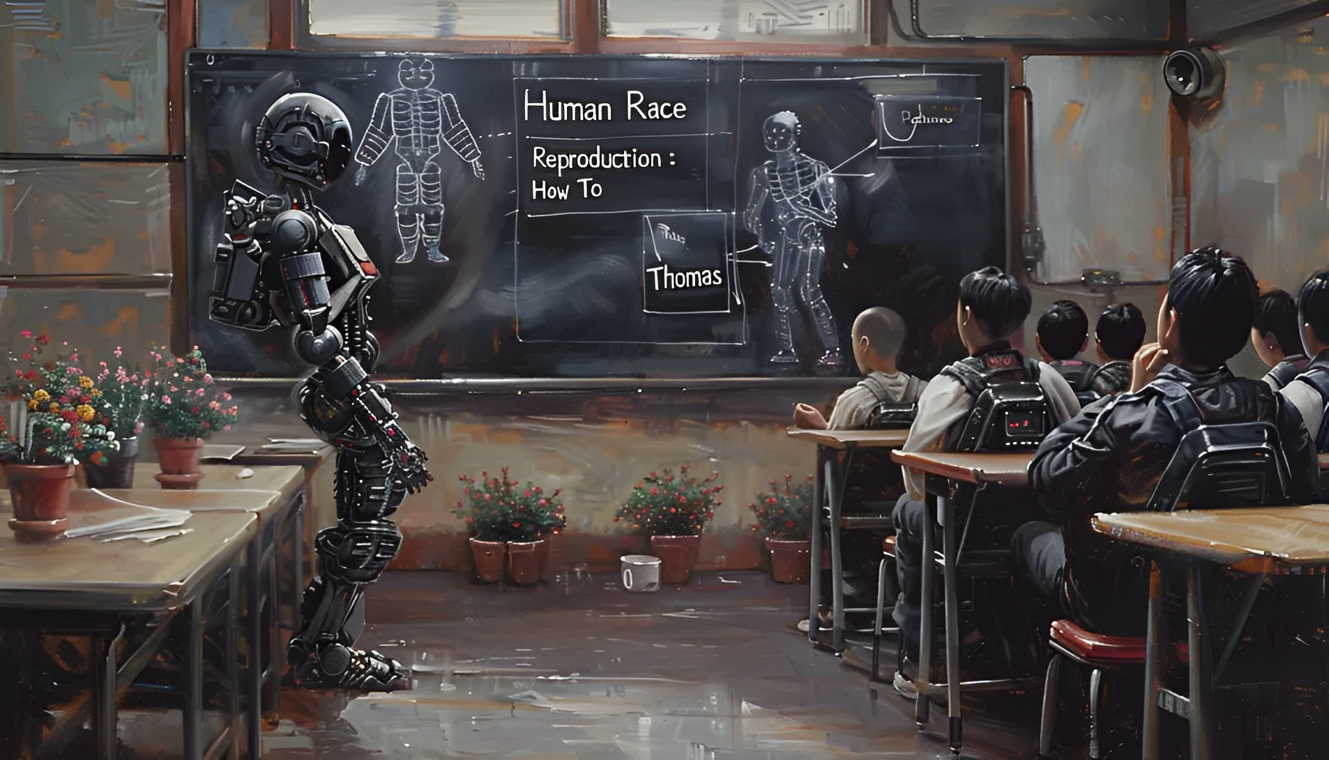 « La Révélation de la Vie » capture un moment de transmission de savoir vital, où les machines, gardiennes du passé, enseignent aux enfants, espoirs de l’avenir, la clé de la perpétuation de leur espèce.
